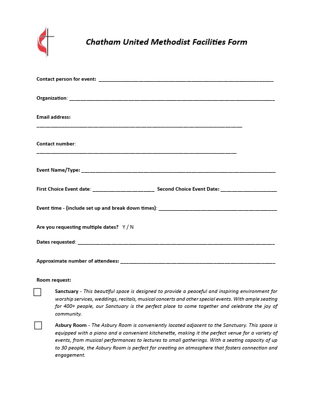 Chatham UMC is dedicated to creating a warm and welcoming environment for all who enter our doors. Our facilities reflect this commitment, offering a range of spaces for worship, fellowship, and community events. If you have questions or would like to schedule a visit, please contact us 973-635-7740 or by filling out the Facility Inquiry Form physically or digitally. We look forward to welcoming you!